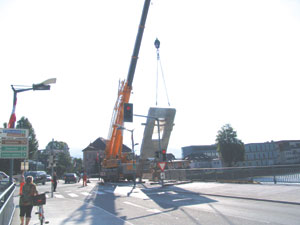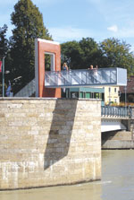 Nun also erfährt endlich auch Hallein die allzu lange entbehrten Segnungen der modernen Kunst. Freilich, die Premiere geriet gleich, so wie von prominenten Halleinern befürchtet, zu einem grandiosen Desaster. Auf einer der wichtigsten Flächen der Stadt, dem mittleren Brückenpfeiler der Stadtbrücke, entstand eine kleine Treppe die zu einem stilisierten Torrahmen führt, dort betritt man einen kleinen Steg. Das Ganze ist ein brutaler Fremdkörper, der überhaupt keinen Bezug zur Stadt Hallein besitzt. Eine erste Umfrage unter Passanten nach deren Meinungsbild läßt sich mit einer einzigen Antwort darstellen. Zitat: ,,Das ganze Ding gehört herunter geschossen!’’ Wann immer das Feuer eröffnet wird hier wurde gründlich die Chance vertan, der modernen Kunst einen Weg in die Herzen der Halleiner zu ebnen.